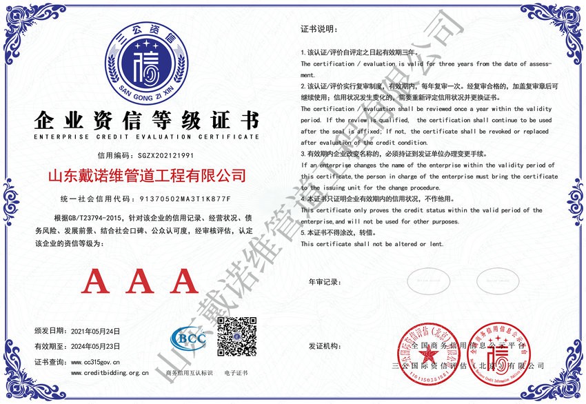管道非開挖修復工程服務企業資質證書